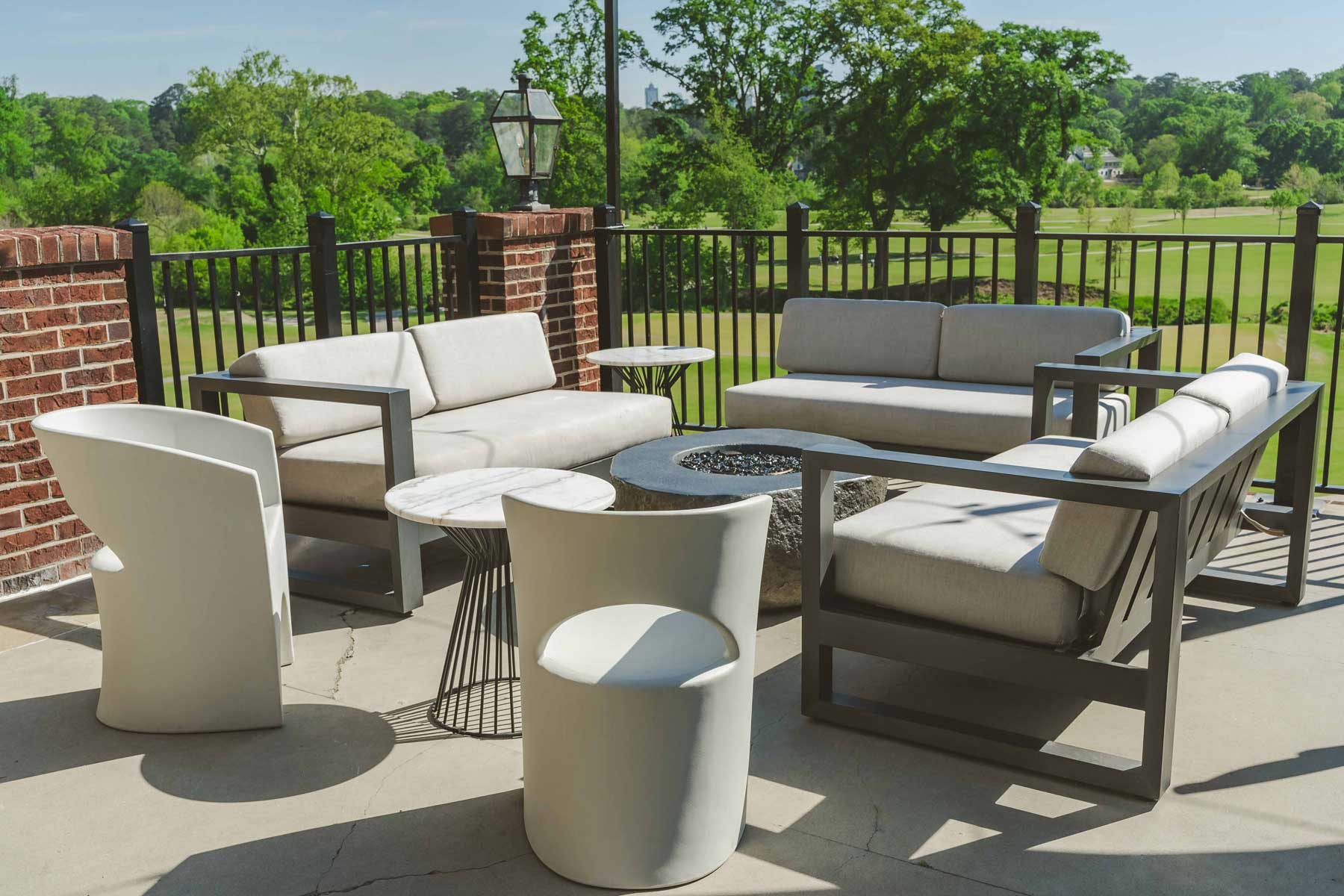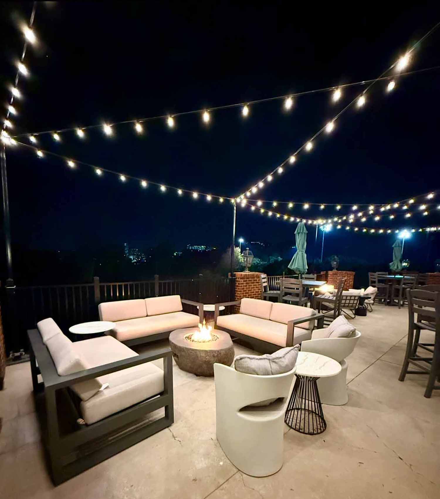 Guests enjoy access to the outdoor bar featuring four customizable taps, cocktail tables, and lounge seating. The Terrace offers year-round mingling with large couches and multiple fire pits, creating a warm and inviting setting for standing receptions and casual events.